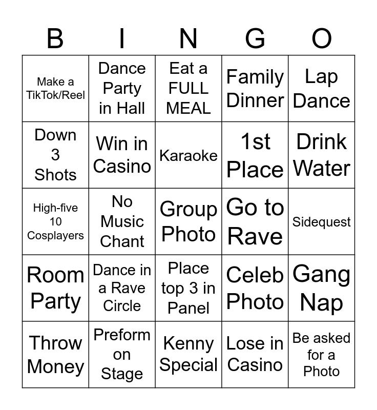 This bingo card has a free space and 24 words: Dance in a Rave Circle, Preform on Stage, Karaoke, Throw Money, Lap Dance, Make a TikTok/Reel, Down 3 Shots, Dance Party in Hall, Go to Rave, Place top 3 in Panel, 1st Place, High-five 10 Cosplayers, Celeb Photo, Gang Nap, Win in Casino, Lose in Casino, Sidequest, Eat a FULL MEAL, Drink Water, No Music Chant, Be asked for a Photo, Room Party, Family Dinner and Kenny Special.