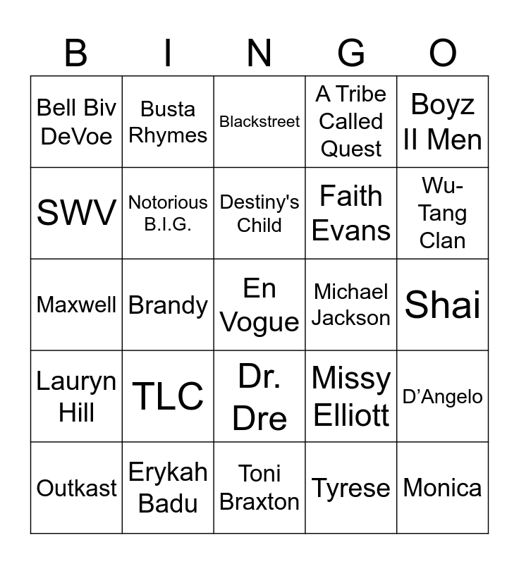 This bingo card has 36 words: Free!, Tupac Shakur Notorious B.I.G. Missy Elliott Lauryn Hill Destiny's Child Aaliyah Boyz II Men Nas Brandy A Tribe Called Quest Janet Jackson Michael Jackson Wu-Tang Clan Bell Biv DeVoe Monica TLC En Vogue Blackstreet Shai D’Angelo, Tupac Shakur, Notorious B.I.G., Missy Elliott, Lauryn Hill, Destiny's Child, Aaliyah, Boyz II Men, Nas, Brandy, A Tribe Called Quest, Janet Jackson, Michael Jackson, Wu-Tang Clan, Bell Biv DeVoe, Monica, TLC, En Vogue, Blackstreet, Shai, D’Angelo, Erykah Badu, Outkast, Toni Braxton, Busta Rhymes, Maxwell, Ginuwine, Faith Evans, SWV, Mary J. Blige, usher, Tyrese, Dr. Dre, Mariah Carey and Da Brat.