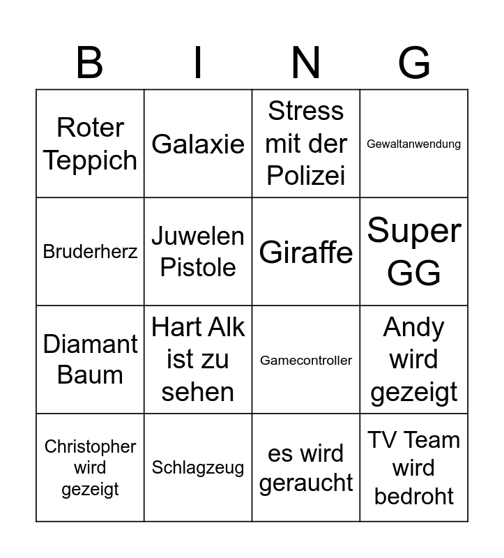 This bingo card has 25 words: 30x Rose, Feuerwerk, Super GG, 30x Rose, Bruderherz, Roter Teppich, Juwelen Pistole, Galaxie, Schlagzeug, Geld Pistole, Diamant Baum, Gamecontroller, 30x Rose, Handherz, Giraffe, 30x Rose, es wird geraucht, Stress mit der Polizei, Hart Alk ist zu sehen, Andy wird gezeigt, Christopher wird gezeigt, chat nachricht, TV Team wird bedroht, Gewaltanwendung and Sub.