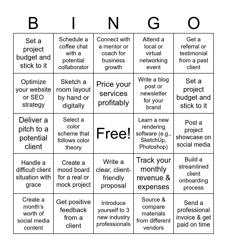 This bingo card has a free space and 24 words: Create a mood board for a real or mock project, Get positive feedback from a client, Price your services profitably, Create a month’s worth of social media content, Get a referral or testimonial from a past client, Set a project budget and stick to it, Optimize your website or SEO strategy, Schedule a coffee chat with a potential collaborator, Learn a new rendering software (e.g., SketchUp, Photoshop), Write a clear, client-friendly proposal, Write a blog post or newsletter for your brand, Deliver a pitch to a potential client, Track your monthly revenue & expenses, Build a streamlined client onboarding process, Sketch a room layout by hand or digitally, Source & compare materials from different vendors, Post a project showcase on social media, Connect with a mentor or coach for business growth, Set a project budget and stick to it, Select a color scheme that follows color theory, Send a professional invoice & get paid on time, Handle a difficult client situation with grace, Attend a local or virtual networking event and Introduce yourself to 3 new industry professionals.
