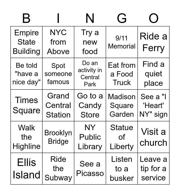This bingo card has 25 words: Brooklyn Bridge, See a Picasso, Do an activity in Central Park, Ellis Island, Ride a Ferry, Empire State Building, Be told "have a nice day", NYC from Above, Madison Square Garden, NY Public Library, Eat from a Food Truck, Times Square, Statue of Liberty, Visit a church, Spot someone famous, Leave a tip for a service, See a "I 'Heart' NY" sign, Try a new food, Find a quiet place, Grand Central Station, Go to a Candy Store, Ride the Subway, Walk the Highline, 9/11 Memorial and Listen to a busker.