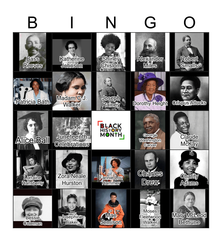 This bingo card has 29 images, a free space and 29 words: Bessie Coleman, Alma Woodsey Thomas, Juneteenth Celebrations, Dr. Daniel Hale Williams, Bass Reeves, Shirley Chislom, Madam C.J. Walker, Zora Neale Hurston, George Washington Carver, Josephine Baker, Claude McKay, Mary McLeod Bethune, Mae Jemison, Moses Fleetwood Walker, Crispus Attucks, Ella Baker, Fannie Lou Hammer, Lorraine Hansberry, Robert Smalls, Alice Ball, Charles Drew, Richard Allen, Dorothy Height, Patricia Bath, Alexander Miles, Katherine Johnson, Charity Adams, Joseph Rainey and Gullah Culture.