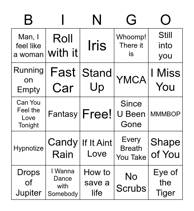 This bingo card has a free space and 42 words: Raspberry Beret, Stand Up, Brickhouse, Candy Rain, No Scrubs, Shape of You, Eye of the Tiger, Oops!...I did it again, Iris, If It Aint Love, MMMBOP, I Miss You, Fantasy, Still into you, My Girl, Every Breath You Take, Silly Love Songs, Can You Feel the Love Tonight, The Love You Save, Roll with it, Running on Empty, No Diggity, Let's groove, Man, I feel like a woman, Main Title, Ironic, YMCA, I don't want to miss a thing, Dancing Machine, Achy Breaky Heart, Don't Stop Til You Get Enough, Hypnotize, Fast Car, How to save a life, Flashdance…What A Feeling, Drops of Jupiter, I Wanna Dance with Somebody, Since U Been Gone, A Rose is Still a Rose, Feel It Still, Whoomp! There it is and Shining Star.