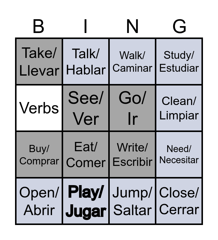 This bingo card has 16 words: Play/ Jugar, Need/ Necesitar, Walk/ Caminar, Take/ Llevar, Buy/ Comprar, Talk/ Hablar, Write/ Escribir, Jump/ Saltar, Verbs, See/ Ver, Open/ Abrir, Study/ Estudiar, Eat/ Comer, Clean/ Limpiar, Go/ Ir and Close/ Cerrar.