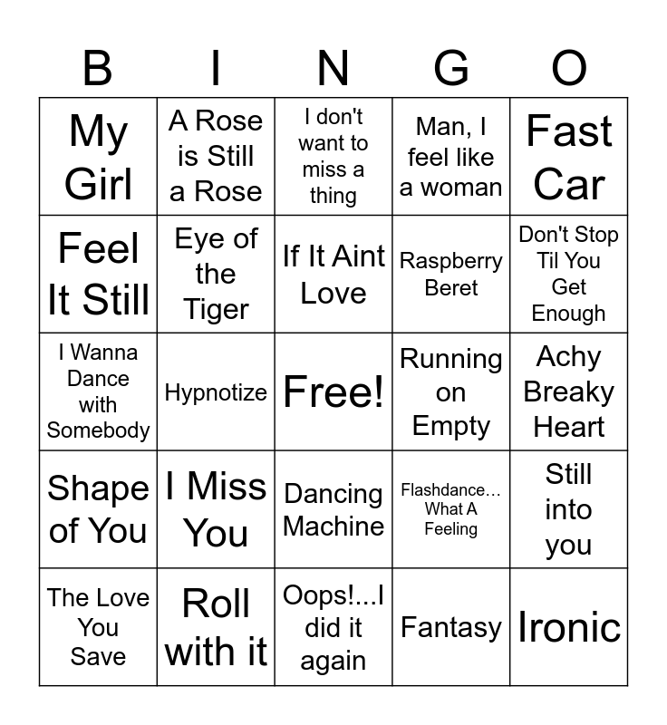 This bingo card has a free space and 42 words: Iris, If It Aint Love, MMMBOP, I Miss You, Fantasy, Still into you, Ironic, YMCA, I don't want to miss a thing, Dancing Machine, Achy Breaky Heart, Don't Stop Til You Get Enough, Hypnotize, Fast Car, How to save a life, Flashdance…What A Feeling, Drops of Jupiter, I Wanna Dance with Somebody, Since U Been Gone, A Rose is Still a Rose, Feel It Still, Whoomp! There it is, Shining Star, My Girl, Every Breath You Take, Silly Love Songs, Raspberry Beret, Stand Up, Brickhouse, Candy Rain, No Scrubs, Shape of You, Eye of the Tiger, Oops!...I did it again, Can You Feel the Love Tonight, The Love You Save, Roll with it, Running on Empty, No Diggity, Let's groove, Man, I feel like a woman and Main Title.