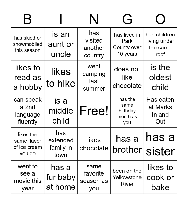 This bingo card has a free space and 24 words: has extended family in town, has a fur baby at home, went camping last summer, went to see a movie this year, has children living under the same roof, has skied or snowmobiled this season, likes to read as a hobby, is an aunt or uncle, has the same birthday month as you, likes chocolate, does not like chocolate, can speak a 2nd language fluently, has a brother, has a sister, likes to hike, been on the Yellowstone River, Has eaten at Marks In and Out, has visited another country, is the oldest child, is a middle child, likes to cook or bake, likes the same flavor of ice cream you do, has lived in Park County over 10 years and same favorite season as you.