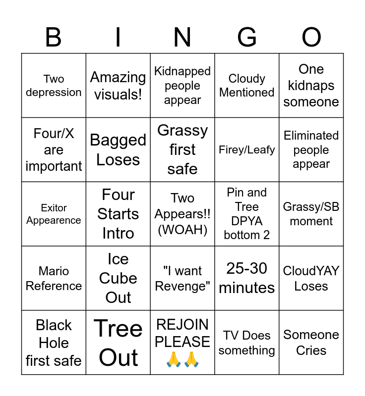 This bingo card has a free space and 24 words: Ice Cube Out, Tree Out, Grassy first safe, Black Hole first safe, One kidnaps someone, Two depression, Four/X are important, Amazing visuals!, Pin and Tree DPYA bottom 2, "I want Revenge", Firey/Leafy, Exitor Appearence, 25-30 minutes, CloudYAY Loses, Bagged Loses, TV Does something, Grassy/SB moment, Kidnapped people appear, Eliminated people appear, Four Starts Intro, Someone Cries, Mario Reference, Cloudy Mentioned and REJOIN PLEASE 🙏🙏.