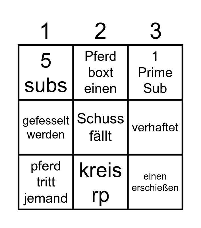 This bingo card has a free space and 12 words: 5 Subs, 100 Bits, einen erschießen, verhaftet, Pferd boxt einen, 1 Prime Sub, kreis rp, 500 Bits, 5 subs, gefesselt werden, pferd tritt jemand and stolpern.
