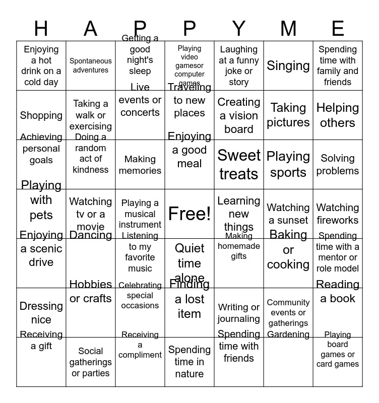 This bingo card has a free space and 48 words: Writing or journaling, Taking pictures, Spending time in nature, Watching tv or a movie, Making memories, Watching fireworks, Spontaneous adventures, Social gatherings or parties, Singing, Quiet time alone, Spending time with family and friends, Playing video gamesor computer games, Playing sports, Sweet treats, Dressing nice, Watching a sunset, Shopping, Helping others, Community events or gatherings, Laughing at a funny joke or story, Creating a vision board, Playing a musical instrument, Enjoying a hot drink on a cold day, Taking a walk or exercising, Reading a book, Live events or concerts, Solving problems, Receiving a gift, Enjoying a good meal, Doing a random act of kindness, Gardening, Learning new things, Spending time with a mentor or role model, Hobbies or crafts, Playing with pets, Making homemade gifts, Baking or cooking, Achieving personal goals, Listening to my favorite music, Celebrating special occasions, Enjoying a scenic drive, Playing board games or card games, Getting a good night's sleep, Receiving a compliment, Traveling to new places, Finding a lost item, Dancing and Spending time with friends.