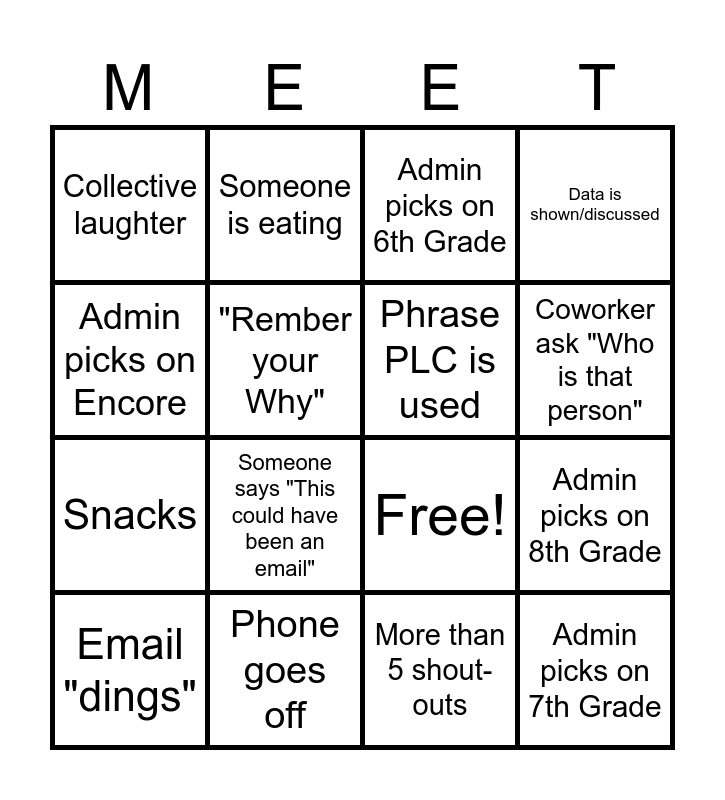 This bingo card has 19 words: Free!, People walk in late, Admin picks on 6th Grade, Admin picks on 7th Grade, Admin picks on 8th Grade, Admin picks on Encore, More than 5 shout-outs, Collective laughter, Someone is eating, Snacks, Someone says "This could have been an email", "Rember your Why", Phrase PLC is used, Phone goes off, Email "dings", Coworker is grading, Data is shown/discussed, Coworker ask "Who is that person" and Someone ask a question that has already been answered.