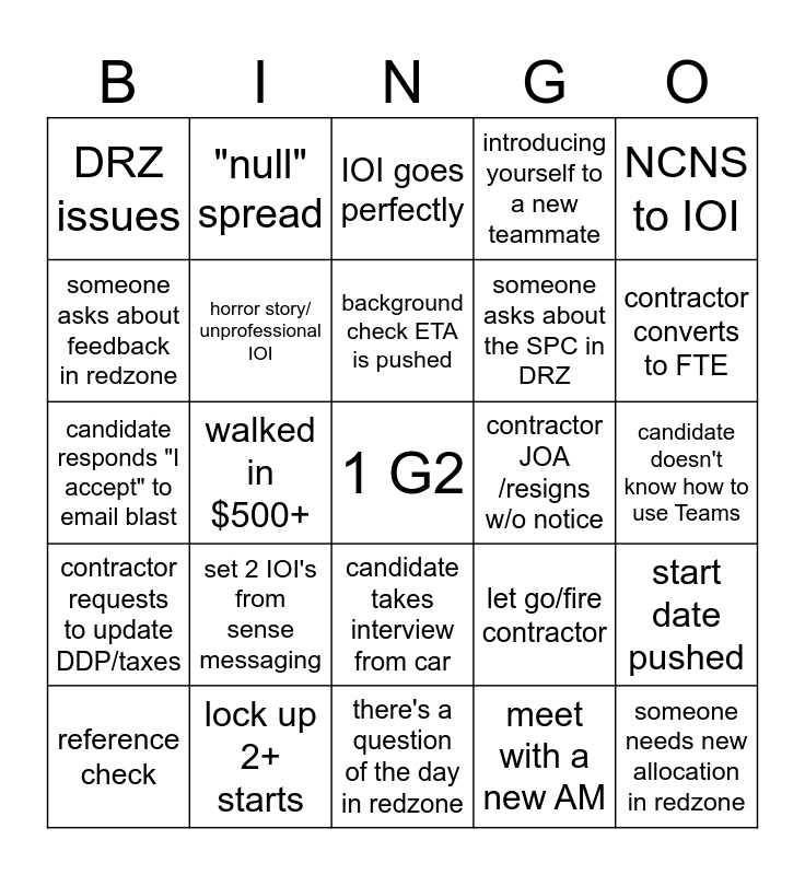 This bingo card has a free space and 33 words: IOI/G2 w/ smoke detector beeping in background, locked up $300+ SPC start, walked in $500+, near miss drug test, contractor requests to update DDP/taxes, horror story/ unprofessional IOI, NCNS to IOI, reference check, "null" spread, 10 STPs, background check ETA is pushed, IOI goes perfectly, Spread jump over $500, candidate backs out after OA, contractor JOA /resigns w/o notice, contractor converts to FTE, lock up 2+ starts, candidate responds "I accept" to email blast, set 2 IOI's from sense messaging, let go/fire contractor, candidate takes interview from car, kids screaming in background during IOI, DRZ issues, candidate doesn't know how to use Teams, there's a question of the day in redzone, someone needs new allocation in redzone, introducing yourself to a new teammate, someone asks about the SPC in DRZ, someone asks about feedback in redzone, start date pushed, unresponsive hiring manager, meet with a new AM and recruiting in a new state/territory.