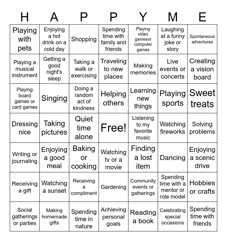 This bingo card has a free space and 48 words: Writing or journaling, Taking pictures, Spending time in nature, Watching tv or a movie, Making memories, Watching fireworks, Spontaneous adventures, Social gatherings or parties, Singing, Quiet time alone, Spending time with family and friends, Playing video gamesor computer games, Playing sports, Sweet treats, Dressing nice, Watching a sunset, Shopping, Helping others, Community events or gatherings, Laughing at a funny joke or story, Creating a vision board, Playing a musical instrument, Enjoying a hot drink on a cold day, Taking a walk or exercising, Reading a book, Live events or concerts, Solving problems, Receiving a gift, Enjoying a good meal, Doing a random act of kindness, Gardening, Learning new things, Spending time with a mentor or role model, Hobbies or crafts, Playing with pets, Making homemade gifts, Baking or cooking, Achieving personal goals, Listening to my favorite music, Celebrating special occasions, Enjoying a scenic drive, Playing board games or card games, Getting a good night's sleep, Receiving a compliment, Traveling to new places, Finding a lost item, Dancing and Spending time with friends.