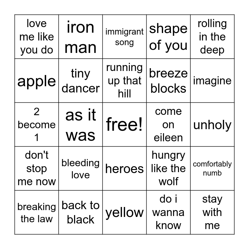 This bingo card has a free space and 41 words: wannabe, 2 become 1, come together, tiny dancer, back to black, heroes, running up that hill, pinball wizard, rolling in the deep, don't stop me now, as it was, shape of you, stay with me, unholy, come on eileen, bleeding love, houdini, love me like you do, i can't get no satisfaction, immigrant song, comfortably numb, i will wait, yellow, breeze blocks, feel good inc., creep, do i wanna know, i wanna be yours, imagine, what makes you beautiful, wonderwall, iron man, breaking the law, pour some sugar on me, hungry like the wolf, apple, you're beautiful, smile, here it goes again, when you were young and shake it out.