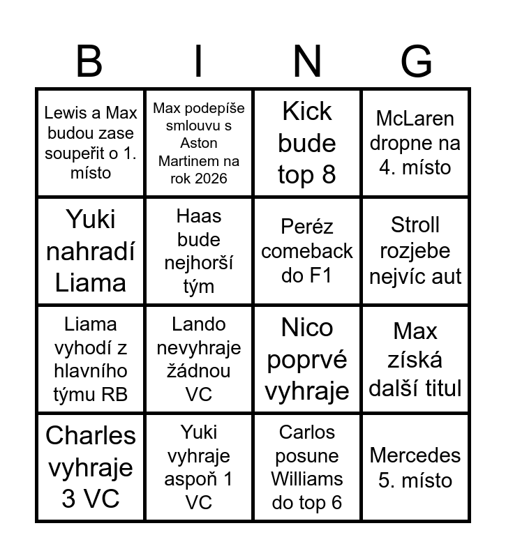 This bingo card has 16 words: Yuki vyhraje aspoň 1 VC, Max získá další titul, Kick bude top 8, Lewis a Max budou zase soupeřit o 1. místo, Liama vyhodí z hlavního týmu RB, Max podepíše smlouvu s Aston Martinem na rok 2026, Nico poprvé vyhraje, Carlos posune Williams do top 6, Yuki nahradí Liama, Haas bude nejhorší tým, Charles vyhraje 3 VC, McLaren dropne na 4. místo, Lando nevyhraje žádnou VC, Stroll rozjebe nejvíc aut, Peréz comeback do F1 and Mercedes 5. místo.