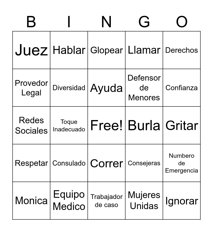 This bingo card has a free space and 43 words: Limites Personales, Ignorar, PAS, Monica, Queja, Mujeres Unidas, Glopear, Trabajadores del piso, Derechos, Equipo Medico, Llamar, Burla, Correr, Consulado, Ejercisio, Trabajador de caso, Arturo, Redes Sociales, No, Confianza, Hablar, Policia, Pretecion de Menores, Juez, Escribir, Gritar, ORR, Telefono de Recursos, Consejeras, Respetar, Reportar, Numbero de Emergencia, Invadir, Toque Inadecuado, Si vez algo, Di Algo, Malas Palabras, Cero Teolerancia, Ayuda, Provedor Legal, Defensor de Menores, Espacio Personal, Diversidad and Juego Brusco.