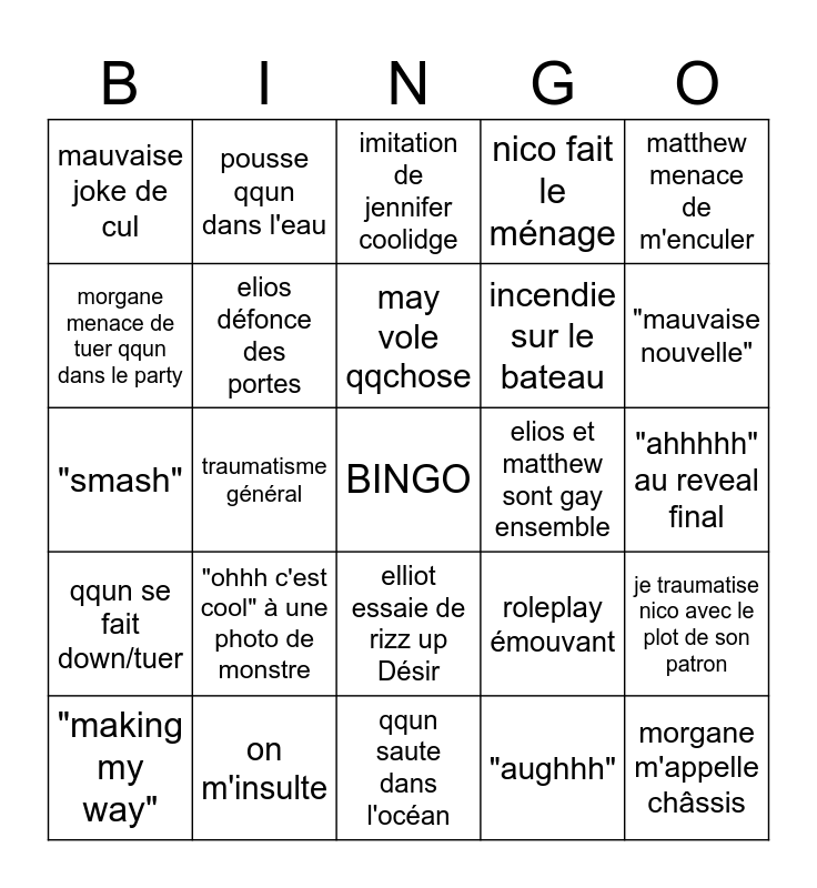 This bingo card has a free space and 24 words: "making my way", "ohhh c'est cool" à une photo de monstre, may vole qqchose, "aughhh", matthew menace de m'enculer, mauvaise joke de cul, pousse qqun dans l'eau, imitation de jennifer coolidge, elios et matthew sont gay ensemble, "ahhhhh" au reveal final, "smash", elios défonce des portes, roleplay émouvant, je traumatise nico avec le plot de son patron, morgane menace de tuer qqun dans le party, on m'insulte, qqun saute dans l'océan, nico fait le ménage, "mauvaise nouvelle", qqun se fait down/tuer, traumatisme général, elliot essaie de rizz up Désir, incendie sur le bateau and morgane m'appelle châssis.