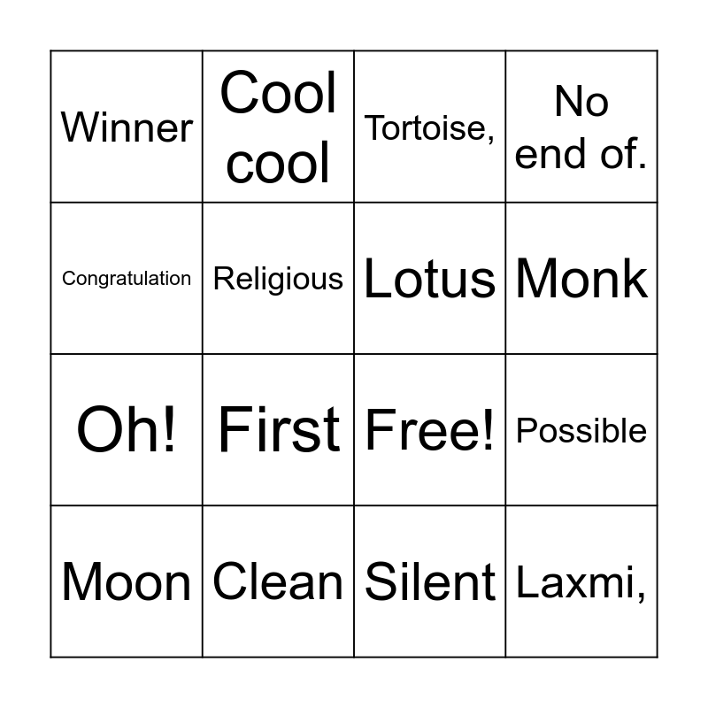 This bingo card has 19 words: Free!, Saathiyo,, Tortoise,, Laxmi,, Possible, Congratulation, Silent, Winner, Cool cool, Oh!, First, Religious, Lotus, Clean, Moon, Flower+Dental, No end of., Monk and Stronger.