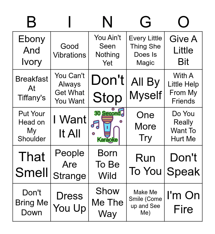 This bingo card has a free space and 34 words: I Want To Hold Your Hand, Make Me Smile (Come up and See Me), I'd Do Anything For Love (But I Won't Do That), It Had To Be You, That Smell, You Can't Always Get What You Want, Give A Little Bit, Don't Bring Me Down, Good Vibrations, Stuck In The Middle With You, Don't Stop, You Ain't Seen Nothing Yet, Don't Stand So Close To Me, (I Can't Get No) Satisfaction, One More Try, With A Little Help From My Friends, Dress You Up, Put Your Head on My Shoulder, People Are Strange, Run To You, Born To Be Wild, Can't Take My Eyes off You, Ebony And Ivory, Do You Really Want To Hurt Me, Show Me The Way, I'm On Fire, Every Little Thing She Does Is Magic, Go Your Own Way, All By Myself, Breakfast At Tiffany's, I Want It That Way, I Want It All, Don't Speak and That's What Friends Are For.