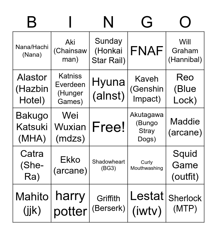 This bingo card has a free space and 24 words: Ekko (arcane), harry potter, Hyuna (alnst), Mahito (jjk), Will Graham (Hannibal), Nana/Hachi (Nana), Alastor (Hazbin Hotel), Aki (Chainsaw man), Akutagawa (Bungo Stray Dogs), Shadowheart (BG3), Kaveh (Genshin Impact), Bakugo Katsuki (MHA), Curly Mouthwashing, Squid Game (outfit), Katniss Everdeen (Hunger Games), Lestat (iwtv), Maddie (arcane), Sunday (Honkai Star Rail), Reo (Blue Lock), Wei Wuxian (mdzs), Sherlock (MTP), Catra (She-Ra), FNAF and Griffith (Berserk).