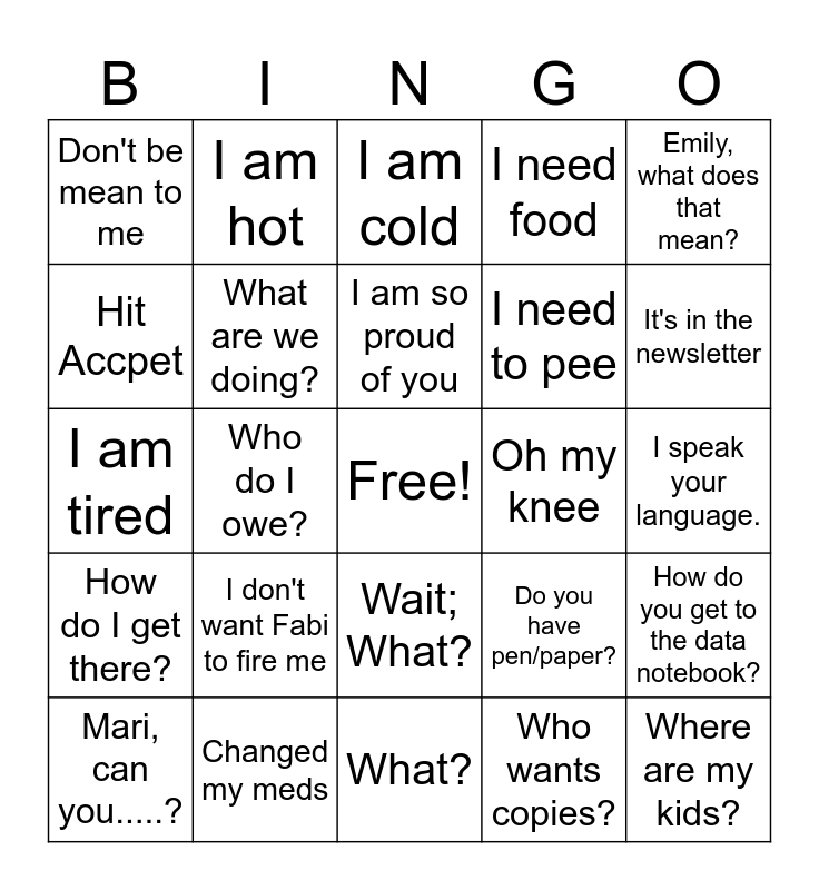 This bingo card has a free space and 29 words: Mari, can you.....?, There's an app for that, Who do I owe?, Tells a story, Don't be mean to me, I am cold, What are we doing?, I don't want Fabi to fire me, Oh my knee, Changed my meds, I speak your language., Where are my kids?, What?, Who wants copies?, It's in the newsletter, Close the door, Wait; What?, How do I get there?, Emily, what does that mean?, I am tired, Do you have pen/paper?, I am nauseous, I need to pee, Hit Accpet, I need food, I am hot, How do you get to the data notebook?, I am so proud of you and I need a nap.