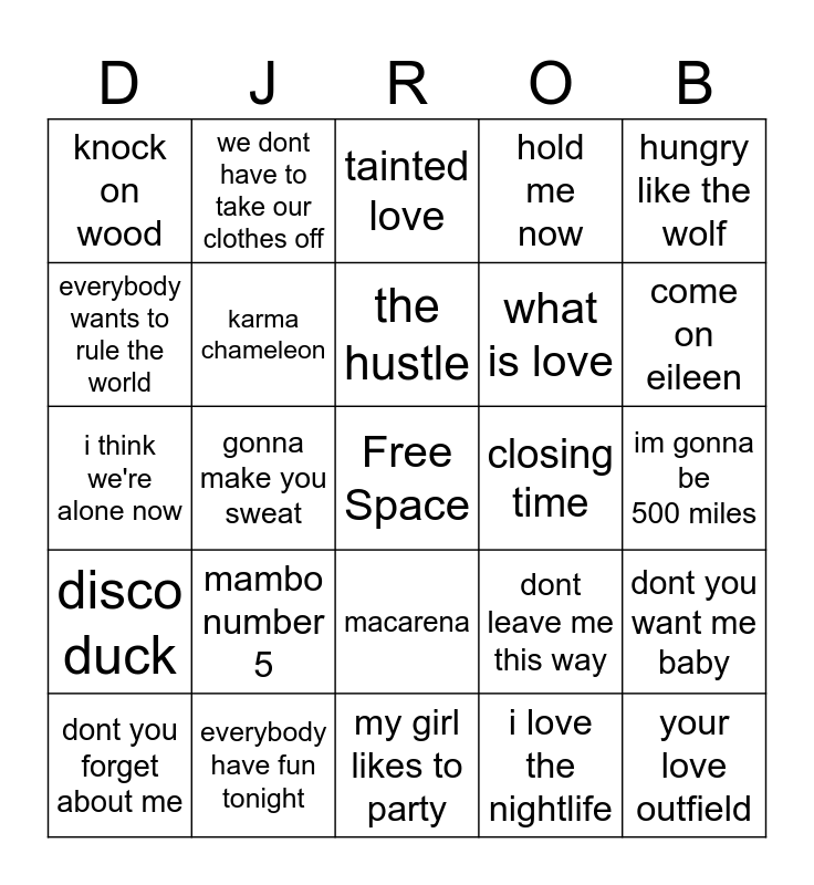 This bingo card has a free space and 34 words: turn the beat around, i love the nightlife, ring my bell, got to be real, disco duck, karma chameleon, hungry like the wolf, dont you forget about me, we dont have to take our clothes off, sunglasses at night, the hustle, tainted love, more more more, play that funky music, closing time, come on eileen, everybody have fun tonight, i think we're alone now, mambo number 5, dont leave me this way, macarena, breakfast at tiffanys, knock on wood, im gonna be 500 miles, my girl likes to party, your love outfield, hold me now, whip it, what is love, everybody wants to rule the world, tubthumping, gonna make you sweat, dont you want me baby and somebodys watching me.