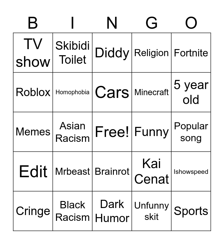 This bingo card has a free space and 24 words: Mrbeast, Black Racism, Cars, Cringe, Fortnite, TV show, Roblox, Skibidi Toilet, Funny, Brainrot, Minecraft, Memes, Kai Cenat, Ishowspeed, Homophobia, Unfunny skit, Popular song, Diddy, 5 year old, Asian Racism, Sports, Edit, Religion and Dark Humor.