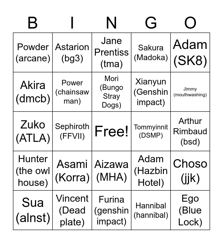 This bingo card has a free space and 24 words: Asami (Korra), Vincent (Dead plate), Mori (Bungo Stray Dogs), Sua (alnst), Adam (SK8), Powder (arcane), Akira (dmcb), Astarion (bg3), Tommyinnit (DSMP), Aizawa (MHA), Xianyun (Genshin impact), Zuko (ATLA), Adam (Hazbin Hotel), Choso (jjk), Power (chainsaw man), Hannibal (hannibal), Arthur Rimbaud (bsd), Jane Prentiss (tma), Jimmy (mouthwashing), Sephiroth (FFVII), Ego (Blue Lock), Hunter (the owl house), Sakura (Madoka) and Furina (genshin impact).