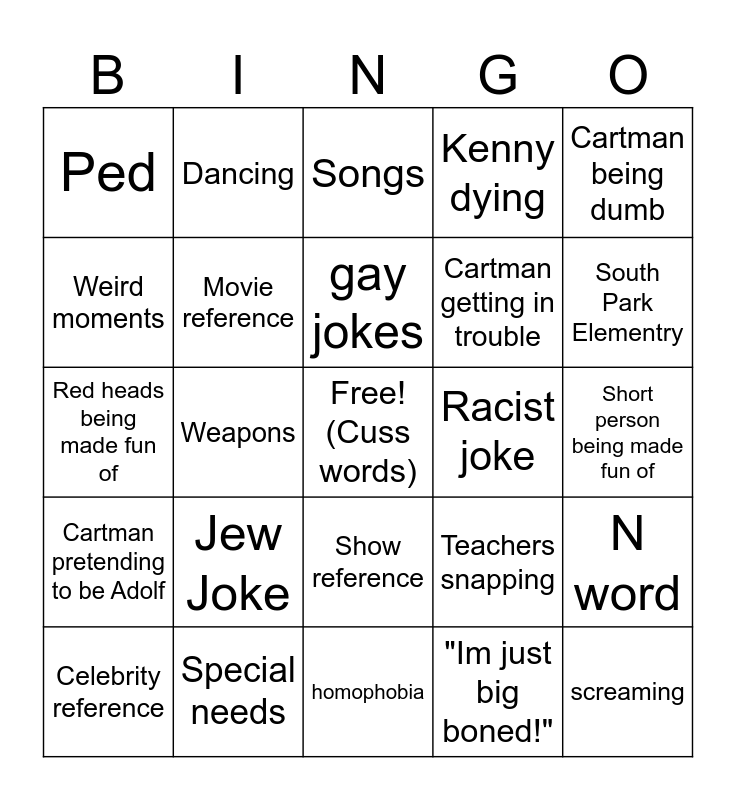 This bingo card has a free space and 24 words: Jew Joke, Special needs, gay jokes, Celebrity reference, Cartman being dumb, Ped, Weird moments, Dancing, Racist joke, Show reference, Cartman getting in trouble, Red heads being made fun of, Teachers snapping, N word, Movie reference, "Im just big boned!", Short person being made fun of, Songs, South Park Elementry, Weapons, screaming, Cartman pretending to be Adolf, Kenny dying and homophobia.