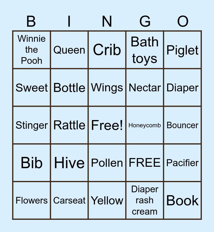 This bingo card has a free space and 25 words: Hive, Yellow, Wings, Flowers, Piglet, Winnie the Pooh, Sweet, Queen, Honeycomb, Pollen, Nectar, Stinger, FREE, Pacifier, Bottle, Onesie, Bouncer, Crib, Diaper, Rattle, Book, Carseat, Bib, Bath toys and Diaper rash cream.
