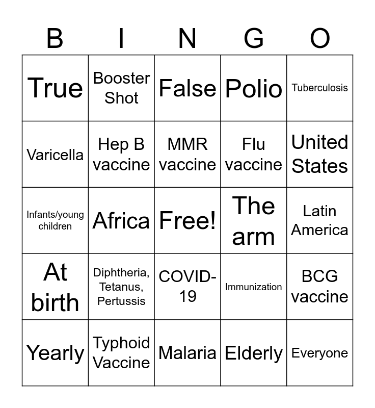 This bingo card has a free space and 24 words: Diphtheria, Tetanus, Pertussis, Typhoid Vaccine, MMR vaccine, Yearly, Tuberculosis, True, Varicella, Booster Shot, The arm, COVID-19, Flu vaccine, Infants/young children, Immunization, BCG vaccine, Hep B vaccine, Elderly, Latin America, False, United States, Africa, Everyone, At birth, Polio and Malaria.