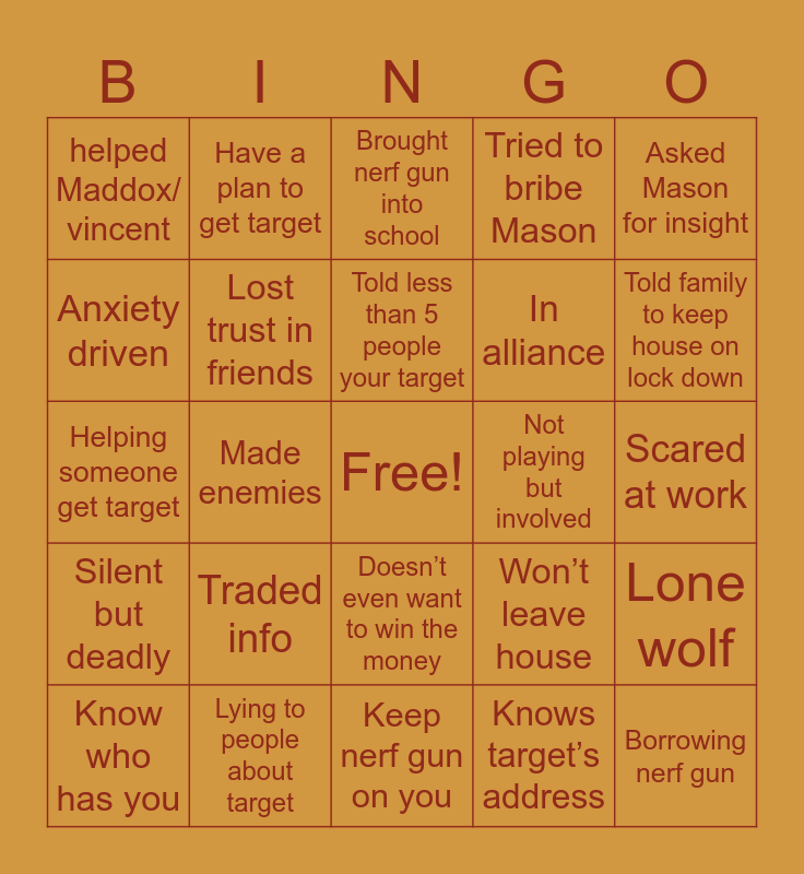 This bingo card has a free space and 24 words: Traded info, Lying to people about target, Told less than 5 people your target, Know who has you, Asked Mason for insight, helped Maddox/ vincent, Anxiety driven, Have a plan to get target, Not playing but involved, Doesn’t even want to win the money, In alliance, Helping someone get target, Won’t leave house, Lone wolf, Lost trust in friends, Knows target’s address, Scared at work, Brought nerf gun into school, Told family to keep house on lock down, Made enemies, Borrowing nerf gun, Silent but deadly, Tried to bribe Mason and Keep nerf gun on you.