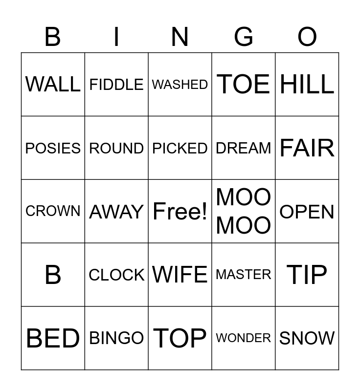 This bingo card has a free space and 24 words: CLOCK, BINGO, PICKED, BED, HILL, WALL, POSIES, FIDDLE, MOO MOO, WIFE, DREAM, CROWN, MASTER, TIP, ROUND, WONDER, OPEN, WASHED, FAIR, AWAY, SNOW, B, TOE and TOP.