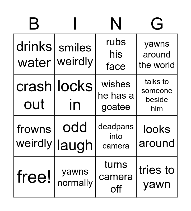 This bingo card has 16 words: yawns normally, looks around, rubs his face, drinks water, frowns weirdly, smiles weirdly, deadpans into camera, turns camera off, crash out, locks in, free!, yawns around the world, odd laugh, talks to someone beside him, wishes he has a goatee and tries to yawn.
