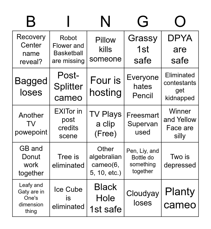 This bingo card has a free space and 24 words: Tree is eliminated, Ice Cube is eliminated, Four is hosting, Leafy and Gaty are in One's dimension thing, DPYA are safe, Recovery Center name reveal?, Bagged loses, Robot Flower and Basketball are missing, Freesmart Supervan used, Other algebralian cameo(6, 5, 10, etc.), Everyone hates Pencil, Another TV powepoint, Pen, Liy, and Bottle do something together, Two is depressed, Post-Splitter cameo, Cloudyay loses, Winner and Yellow Face are silly, Pillow kills someone, Eliminated contestants get kidnapped, EXITor in post credits scene, Planty cameo, GB and Donut work together, Grassy 1st safe and Black Hole 1st safe.
