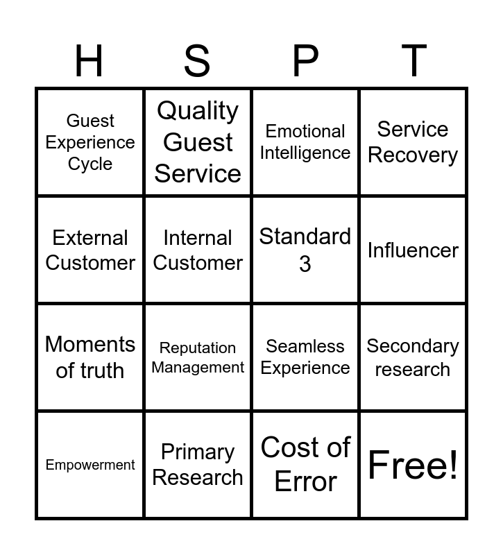This bingo card has 16 words: Primary Research, Secondary research, Emotional Intelligence, Guest Experience Cycle, Moments of truth, Quality Guest Service, Seamless Experience, Cost of Error, External Customer, Internal Customer, Empowerment, Service Recovery, Reputation Management, Influencer, Standard 3 and Free!.