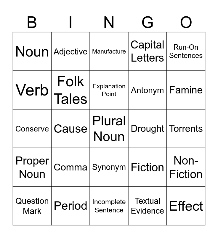 This bingo card has a free space and 24 words: Comma, Period, Explanation Point, Question Mark, Run-On Sentences, Noun, Verb, Adjective, Drought, Synonym, Antonym, Conserve, Fiction, Non-Fiction, Folk Tales, Textual Evidence, Torrents, Manufacture, Famine, Cause, Effect, Proper Noun, Capital Letters and Incomplete Sentence.