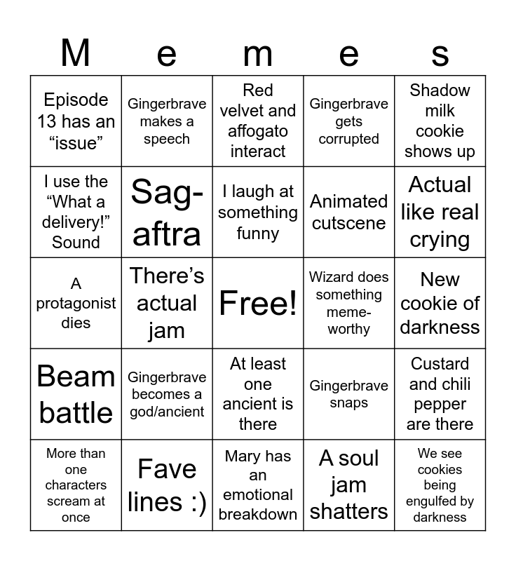 This bingo card has a free space and 24 words: Gingerbrave becomes a god/ancient, Fave lines :), I laugh at something funny, More than one characters scream at once, Shadow milk cookie shows up, Episode 13 has an “issue”, I use the “What a delivery!” Sound, Gingerbrave makes a speech, Wizard does something meme-worthy, At least one ancient is there, Animated cutscene, A protagonist dies, Gingerbrave snaps, Custard and chili pepper are there, Sag-aftra, A soul jam shatters, New cookie of darkness, Red velvet and affogato interact, Actual like real crying, There’s actual jam, We see cookies being engulfed by darkness, Beam battle, Gingerbrave gets corrupted and Mary has an emotional breakdown.