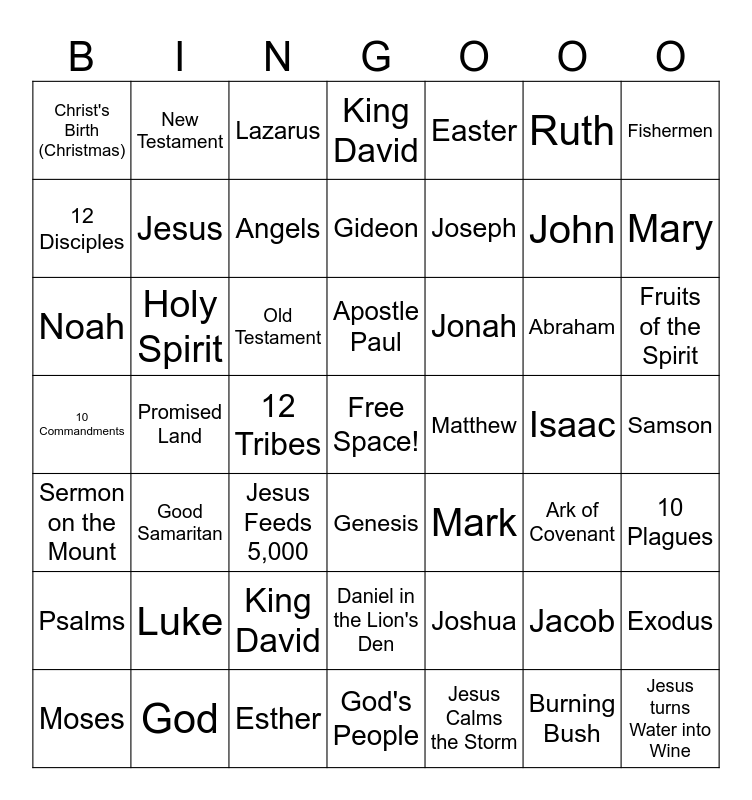This bingo card has a free space and 48 words: Joshua, John, God's People, Promised Land, Old Testament, Samson, New Testament, God, Ruth, Genesis, Fishermen, King David, Abraham, Jonah, Psalms, Isaac, 12 Disciples, Mary, Jacob, Easter, Joseph, 12 Tribes, Christ's Birth (Christmas), Jesus, Exodus, Angels, Fruits of the Spirit, Moses, Apostle Paul, Holy Spirit, Burning Bush, Matthew, 10 Plagues, Luke, 10 Commandments, Mark, Ark of Covenant, Noah, Jesus Feeds 5,000, King David, Sermon on the Mount, Jesus turns Water into Wine, Lazarus, Esther, Gideon, Daniel in the Lion's Den, Good Samaritan and Jesus Calms the Storm.