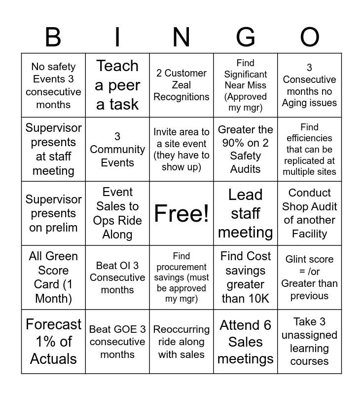 This bingo card has a free space and 24 words: Beat OI 3 Consecutive months, Beat GOE 3 consecutive months, Invite area to a site event (they have to show up), Forecast 1% of Actuals, 3 Consecutive months no Aging issues, No safety Events 3 consecutive months, Supervisor presents at staff meeting, Teach a peer a task, Lead staff meeting, Find procurement savings (must be approved my mgr), Greater the 90% on 2 Safety Audits, Supervisor presents on prelim, Find Cost savings greater than 10K, Glint score = /or Greater than previous, 3 Community Events, Attend 6 Sales meetings, Conduct Shop Audit of another Facility, 2 Customer Zeal Recognitions, Find efficiencies that can be replicated at multiple sites, Event Sales to Ops Ride Along, Take 3 unassigned learning courses, All Green Score Card (1 Month), Find Significant Near Miss (Approved my mgr) and Reoccurring ride along with sales.