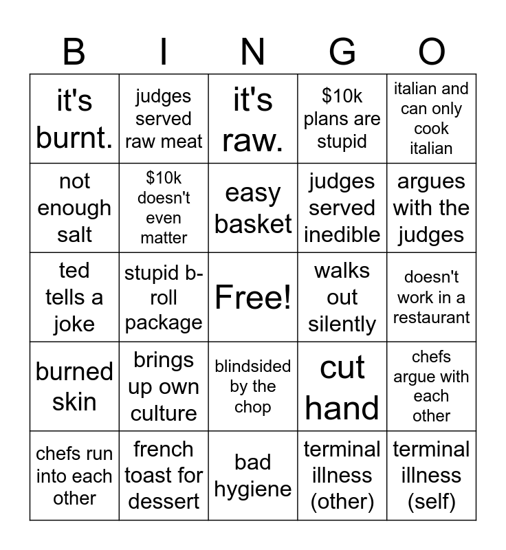 This bingo card has a free space and 30 words: french toast for dessert, "deconstructed", stupid b-roll package, pronounces it douchely, it's burnt., it's raw., $10k doesn't even matter, blindsided by the chop, walks out silently, bad hygiene, doesn't work in a restaurant, terminal illness (self), terminal illness (other), forgot an ingredient, argues with the judges, never heard of ingredient, cut hand, burned skin, brings up own culture, italian and can only cook italian, ted tells a joke, judges served bones, judges served raw meat, judges served inedible, not enough salt, $10k plans are stupid, chefs argue with each other, chefs run into each other, easy basket and talks about kids.