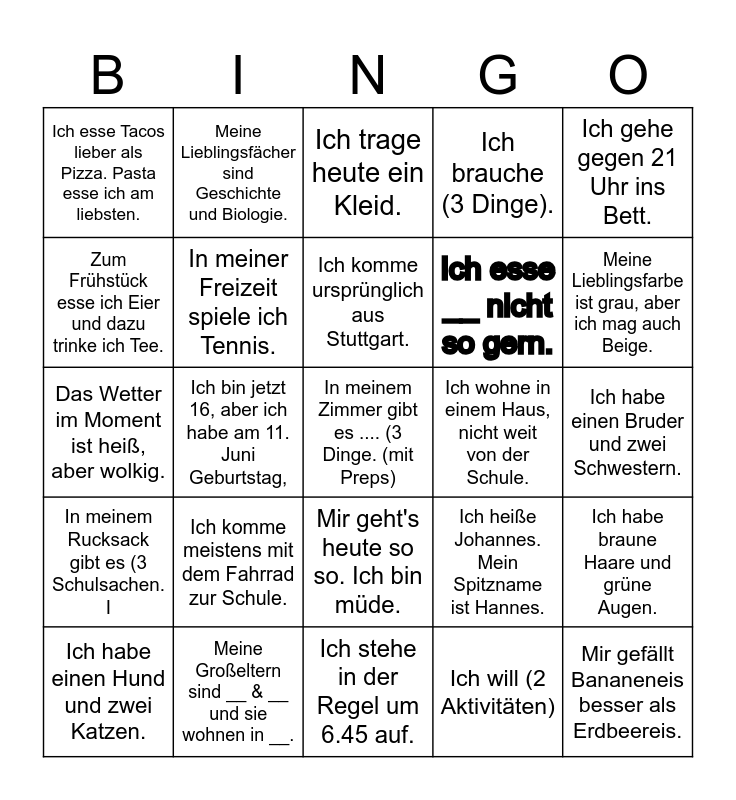 This bingo card has 25 words: Ich komme meistens mit dem Fahrrad zur Schule., Ich stehe in der Regel um 6.45 auf., Ich komme ursprünglich aus Stuttgart., Ich habe einen Hund und zwei Katzen., Ich gehe gegen 21 Uhr ins Bett., Ich esse Tacos lieber als Pizza. Pasta esse ich am liebsten., Zum Frühstück esse ich Eier und dazu trinke ich Tee., Meine Lieblingsfächer sind Geschichte und Biologie., Ich wohne in einem Haus, nicht weit von der Schule., Mir geht's heute so so. Ich bin müde., Ich esse __ nicht so gern., Das Wetter im Moment ist heiß, aber wolkig., Ich heiße Johannes. Mein Spitzname ist Hannes., Ich habe braune Haare und grüne Augen., In meiner Freizeit spiele ich Tennis., Mir gefällt Bananeneis besser als Erdbeereis., Ich habe einen Bruder und zwei Schwestern., Ich trage heute ein Kleid., Meine Lieblingsfarbe ist grau, aber ich mag auch Beige., Ich bin jetzt 16, aber ich habe am 11. Juni Geburtstag,, In meinem Zimmer gibt es .... (3 Dinge. (mit Preps), Meine Großeltern sind __ & __ und sie wohnen in __., In meinem Rucksack gibt es (3 Schulsachen. I, Ich brauche (3 Dinge). and Ich will (2 Aktivitäten).