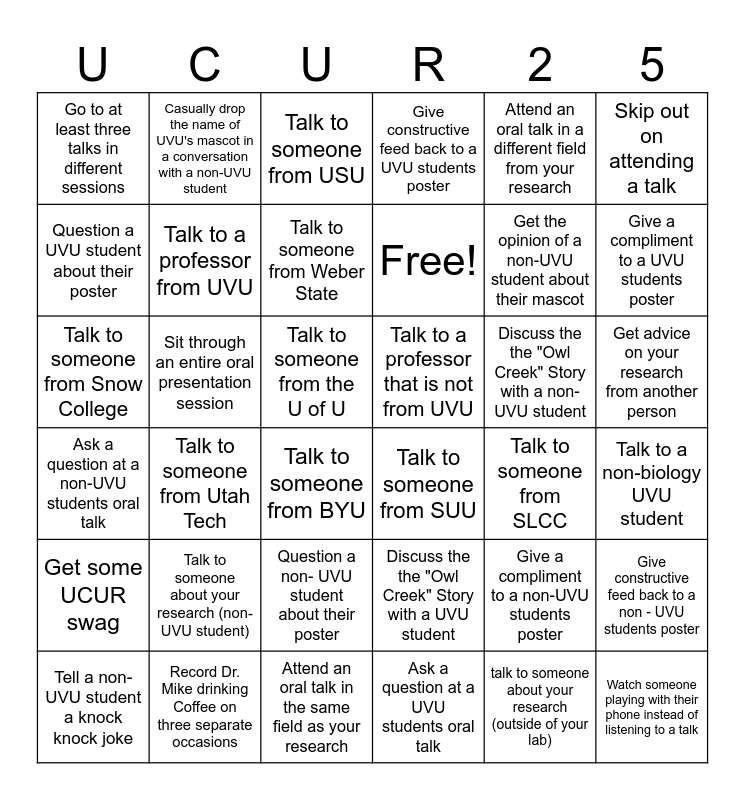 This bingo card has 36 words: Discuss the the "Owl Creek" Story with a UVU student, Question a non- UVU student about their poster, Ask a question at a UVU students oral talk, Question a UVU student about their poster, Ask a question at a non-UVU students oral talk, Talk to a professor that is not from UVU, Talk to a professor from UVU, Attend an oral talk in the same field as your research, Attend an oral talk in a different field from your research, Give a compliment to a non-UVU students poster, Give a compliment to a UVU students poster, Give constructive feed back to a UVU students poster, Give constructive feed back to a non - UVU students poster, Sit through an entire oral presentation session, Free!, Go to at least three talks in different sessions, Get some UCUR swag, Discuss the the "Owl Creek" Story with a non- UVU student, Talk to someone from Snow College, Talk to someone from USU, Talk to someone from the U of U, Talk to someone from Utah Tech, Talk to someone from SUU, Talk to someone from BYU, Talk to someone from SLCC, Casually drop the name of UVU's mascot in a conversation with a non-UVU student, Get the opinion of a non-UVU student about their mascot, Record Dr. Mike drinking Coffee on three separate occasions, Talk to someone from Weber State, Skip out on attending a talk, Watch someone playing with their phone instead of listening to a talk, Tell a non-UVU student a knock knock joke, Talk to a non-biology UVU student, Get advice on your research from another person, Talk to someone about your research (non-UVU student) and talk to someone about your research (outside of your lab).