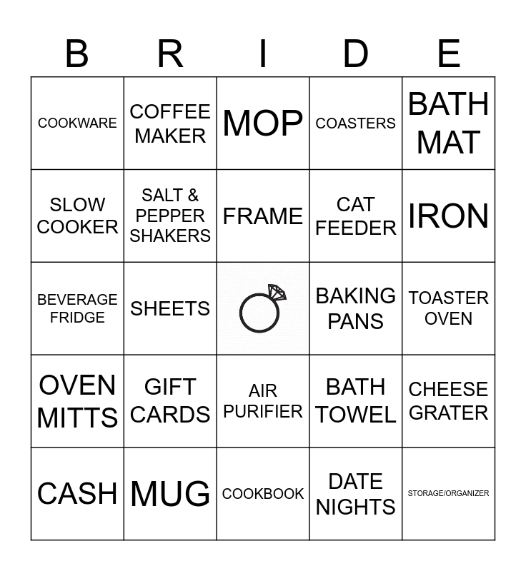 This bingo card has a free space and 42 words: CANDLE, FRAME, NINJA SLUSHIE, GIFT CARDS, DATE NIGHTS, CHEESE GRATER, STORAGE/ORGANIZER, NAPKIN HOLDER, MOP, AIR PURIFIER, TOASTER OVEN, IRON, SHEETS, BATH MAT, KITCHEN TOWELS, BATH TOWEL, TRASH CAN, BEVERAGE FRIDGE, ICE MAKER, COFFEE MAKER, SLOW COOKER, CUTTING BOARDS, COOKING UTENSILS, COOKWARE, SPORTS CAMERA, SPICE JARS, CAT FEEDER, BATTER BOWL, CHIEFS ITEM, SLEEPWEAR, QUILT, OVEN MITTS, SALT & PEPPER SHAKERS, COOKBOOK, WHISK, CASH, MUG, BAKING PANS, KNIFE SET, PERSONALIZED GIFT, COASTERS and AMAZON ECHO.