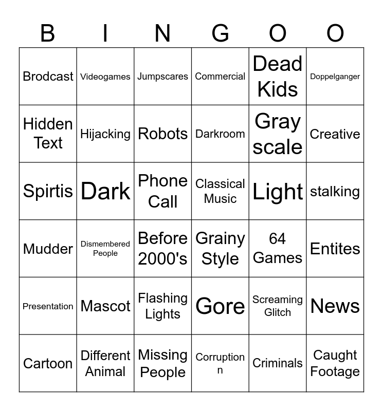 This bingo card has 36 words: Gore, Flashing Lights, Corruption n, Hidden Text, Mudder, Classical Music, Hijacking, Missing People, Dead Kids, Screaming Glitch, Creative, Commercial, News, Dark, Darkroom, Brodcast, Presentation, Light, Spirtis, Jumpscares, Phone Call, Dismembered People, Grainy Style, Before 2000's, 64 Games, Videogames, Gray scale, Different Animal, Robots, Doppelganger, Caught Footage, Cartoon, Entites, stalking, Mascot and Criminals.