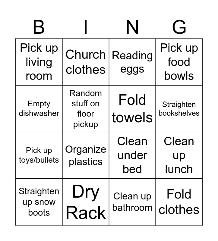 This bingo card has 16 words: Dry Rack, Clean up lunch, Reading eggs, Pick up living room, Pick up toys/bullets, Church clothes, Clean under bed, Clean up bathroom, Empty dishwasher, Random stuff on floor pickup, Straighten up snow boots, Pick up food bowls, Organize plastics, Straighten bookshelves, Fold towels and Fold clothes.