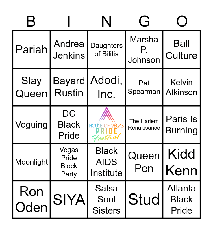 This bingo card has a free space and 29 words: William Dorsey Swann, SIYA, Daughters of Bilitis, Holiday Heart, Ball Culture, Pariah, Bayard Rustin, Adodi, Inc., The Harlem Renaissance, Kidd Kenn, Ron Oden, DC Black Pride, Stud, Atlanta Black Pride, Voguing, Big Freedia, Salsa Soul Sisters, Queen Pen, Kelvin Atkinson, Moonlight, Vegas Pride Block Party, “pay it no mind”, Pat Spearman, Paris Is Burning, Slay Queen, Andrea Jenkins, Black AIDS Institute, Marsha P. Johnson and Sister Outsider.