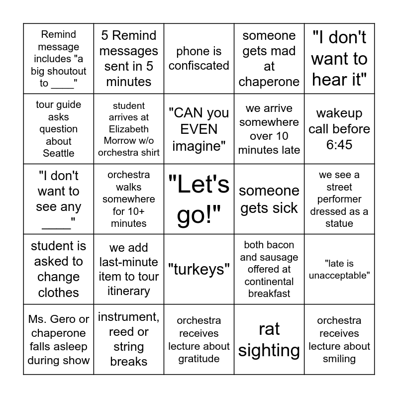 This bingo card has a free space and 39 words: someone sets off metal detector, 3+ group photos in 24 hours, Remind message sent after 10:30 PM, student arrives at Elizabeth Morrow w/o orchestra shirt, Ms. Gero or chaperone falls asleep during show, "turkeys", "CAN you EVEN imagine", "Ms. Gero's so popuuuuular", "I don't want to hear it", student is asked to change clothes, orchestra walks somewhere for 10+ minutes, someone gets mad at chaperone, orchestra receives lecture about smiling, we see a street performer dressed as a statue, someone gets sick, we add last-minute item to tour itinerary, "I don't get paid enough for this", Remind message includes "a big shoutout to ____", group meal includes caesar salad and pizza, both bacon and sausage offered at continental breakfast, tour guide asks question about Seattle, orchestra receives lecture about gratitude, we arrive somewhere over 10 minutes late, wakeup call before 6:45, Ms. Gero talks about her height, we skip item on tour itinerary, Ms. Gero discourages making out, orchestra receives lecture about formality, orchestra receives lecture about cleanliness, 5 Remind messages sent in 5 minutes, someone interrupts tour guide to tell arbitrary story, clinician suggests different tempo, phone is confiscated, instrument, reed or string breaks, rat sighting, sophomore boy temporarily goes missing, "late is unacceptable", "I don't want to see any ____" and "Curly and Moe".