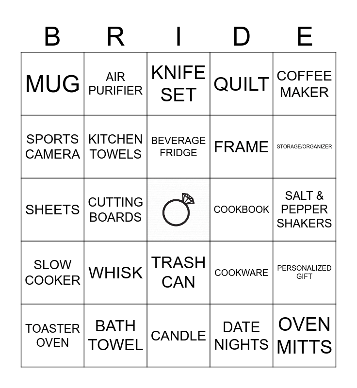 This bingo card has a free space and 41 words: IRON, SHEETS, BATH MAT, KITCHEN TOWELS, BATH TOWEL, TRASH CAN, BEVERAGE FRIDGE, ICE MAKER, COFFEE MAKER, SLOW COOKER, CUTTING BOARDS, QUILT, OVEN MITTS, SALT & PEPPER SHAKERS, COOKBOOK, WHISK, CASH, MUG, BAKING PANS, KNIFE SET, PERSONALIZED GIFT, COASTERS, CANDLE, FRAME, NINJA SLUSHIE, GIFT CARDS, DATE NIGHTS, CHEESE GRATER, STORAGE/ORGANIZER, NAPKIN HOLDER, MOP, AIR PURIFIER, TOASTER OVEN, COOKING UTENSILS, COOKWARE, SPORTS CAMERA, SPICE JARS, CAT FEEDER, BATTER BOWL, CHIEFS ITEM and SLEEPWEAR.
