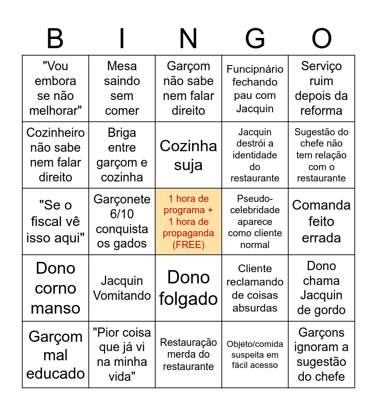This bingo card has a free space and 24 words: Jacquin Vomitando, "Pior coisa que já vi na minha vida", Cozinha suja, Garçom mal educado, Serviço ruim depois da reforma, "Vou embora se não melhorar", Cozinheiro não sabe nem falar direito, Mesa saindo sem comer, Pseudo-celebridade aparece como cliente normal, Dono folgado, Jacquin destrói a identidade do restaurante, "Se o fiscal vê isso aqui", Cliente reclamando de coisas absurdas, Dono chama Jacquin de gordo, Briga entre garçom e cozinha, Objeto/comida suspeita em fácil acesso, Comanda feito errada, Garçom não sabe nem falar direito, Sugestão do chefe não tem relação com o restaurante, Garçonete 6/10 conquista os gados, Garçons ignoram a sugestão do chefe, Dono corno manso, Funcipnário fechando pau com Jacquin and Restauração merda do restaurante.