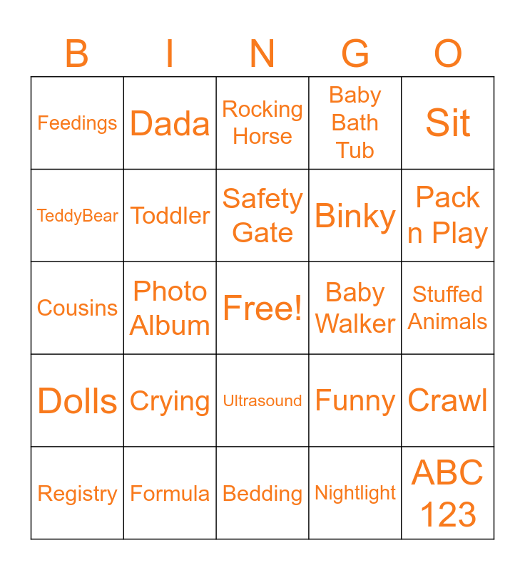 This bingo card has a free space and 50 words: Giggles, ABC 123, Diaper Pail, Bedding, Crying, Cuddles, Dada, Bunny, TeddyBear, Colors, Toddler, Baby Bath Tub, Crawl, Funny, Walk, Safety Pins, Safety Gate, Baby Walker, Mama, Sit, Photo Album, Nightlight, Feedings, Binky, Sleeper, Potty Training, Pack n Play, Infant, Rocking Horse, Ultrasound, Play, Mommy, Daddy, Picture Book, Formula, First Words, Funny, Safety Pins, Family, Stuffed Animals, Baby Shower, Pacifier, Baby Walker, Cradle, Registry, Cousins, Rubber Ducky, Rompers, Dolls and Baby Swing.